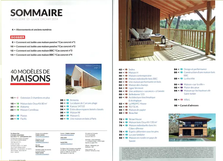 ► Publication, dans le Hors-serie N°13 d'août et septembre 2014 de la revue Maison Eco Bois, du projet de logement individuelle intitulée "Habitation L01" en page 96 et 97. Dans le cadre de ce hors-serie deux pages ont été proposées et consacrées pour promouvoir l'architecture en bois associé aux energies renouvlables.